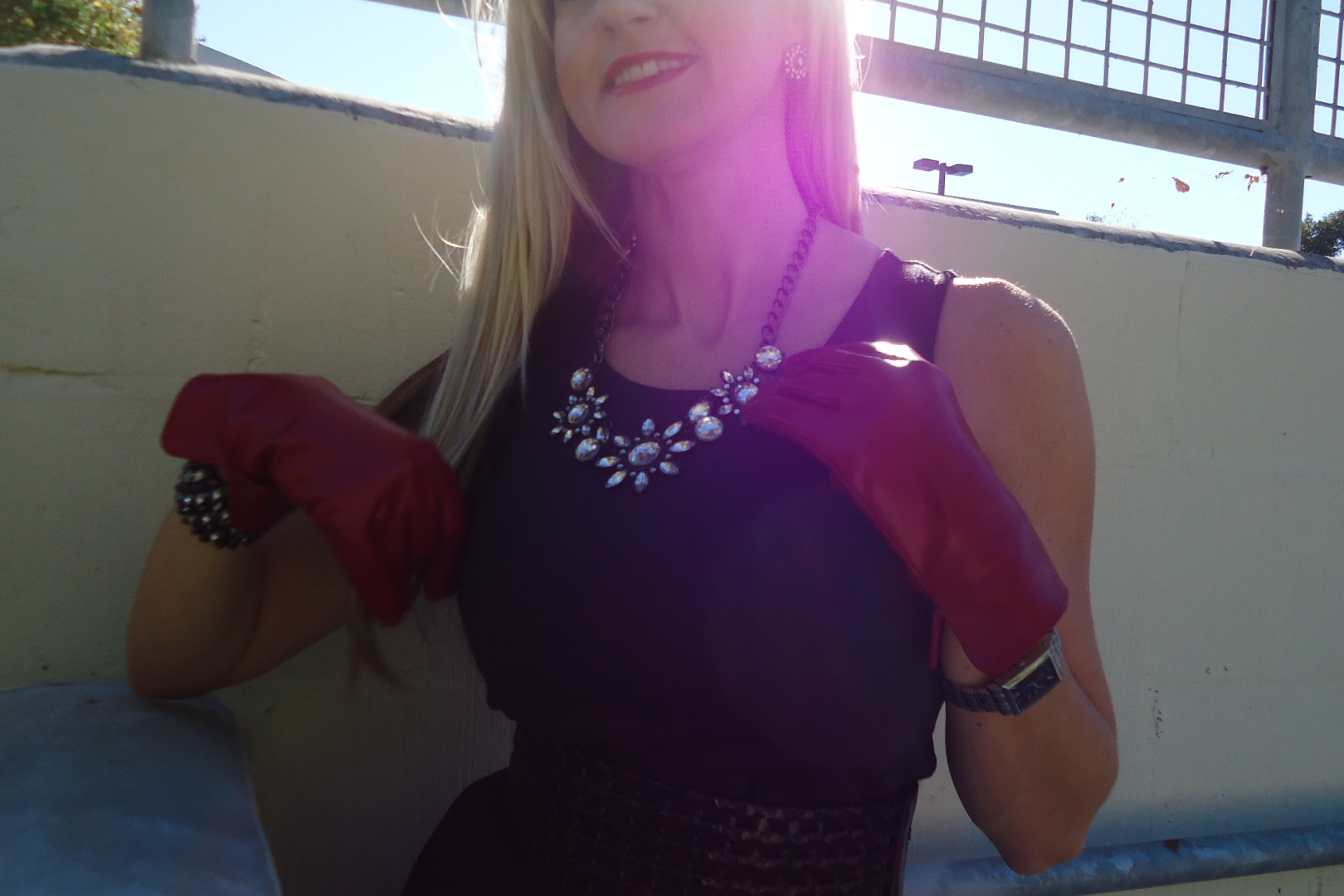 The spotlight of this look is the Over Ice necklace ($30) from mark. It has that 60’s appeal but made modern. The chunky hematite chain makes this necklace wearable with a casual sweater or your best LBD. Also from mark are the Star Studded Earrings ($14) and the Glove Story Gloves ($24). Gloves are having a major moment right now worn with everything from your parka to your chic office wear and these red genuine leather version are the perfect price, quality and style! They kinda hide my watch and navy and rhinestone bracelet but I love it when they peek out! Last but not least… the red lips! I also lined my eyes in blue and used white eyeshadow but you can’t see… anything to theme out the day I tell ya!