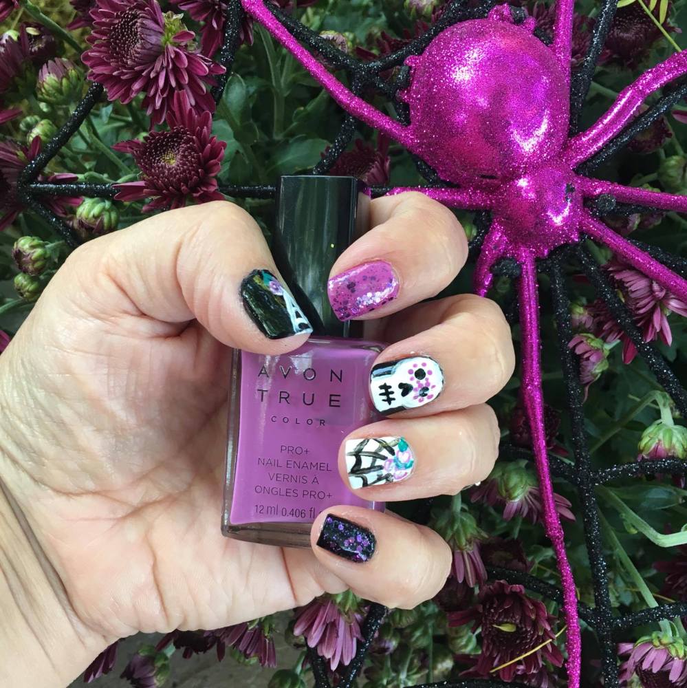 Rebecca used Avon True Color Pro Nailwear in white, purple, and black for her fun and spooky spiderweb mixed mani! Topped with a little dazzlers for a little bling and the Avon True Color Top Coat to seal it all in. To see more head over to A Mom With Lipstick Kisses! Avon True Color Nailwears are currently on sale for $5.99!