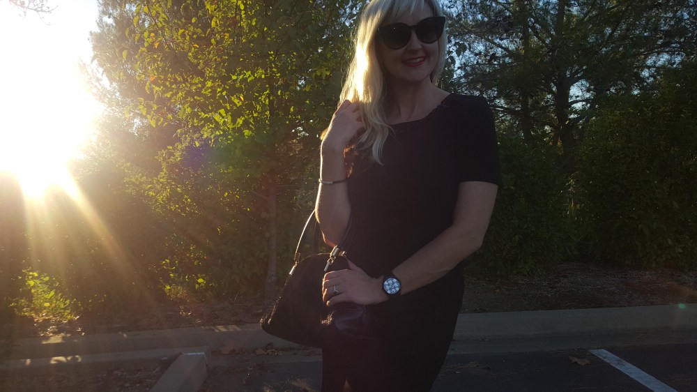 The dress features a removable black chain detail around the neckline so you don’t need a necklace. You could easily remove it and pair this dress with your favorite statement necklace.  For this classy af look, I went with a statement earring instead with the Avon Modern Pearlesque Tassel Earrings.  For the rest of my jewelry I went with a simple black watch (Michael Kors) and a simple sparkly bracelet (Avon Modern Glamour Jet Pave Stretch Bracelet).  On lips mark. Vinyl Pout Lip Paint in Glamour.  (could that be any more perfect of a name for this look!?)