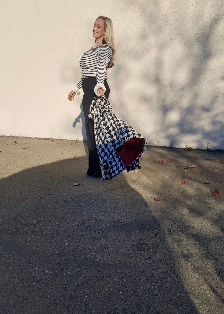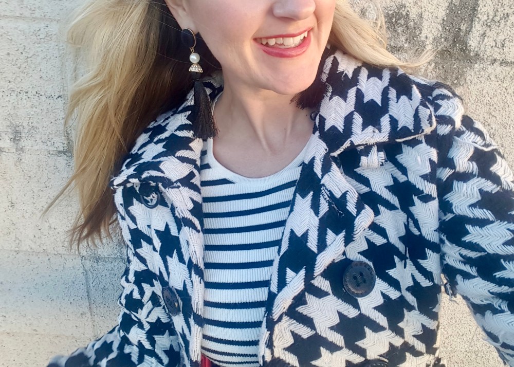 Wearing Winter Weather Look: White House Black Market Sweater (last seen here), White House Black Market Flare Pants, Express Houndstooth Jacket, mark. High On Glitter Platform Heels, Avon Tassel Earrings.
