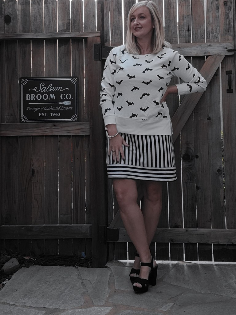 I found the most adorable and comfy! bat print sweatshirt at Target. I’ve basically lived in it for the past month. Its lightweight, has slits on the side and oh so soft. I paired it over a black and white striped summer dress for an easy day look, its still 90 degrees here folks! However, I’ve worn it more just lounging around, making spirits spooky!