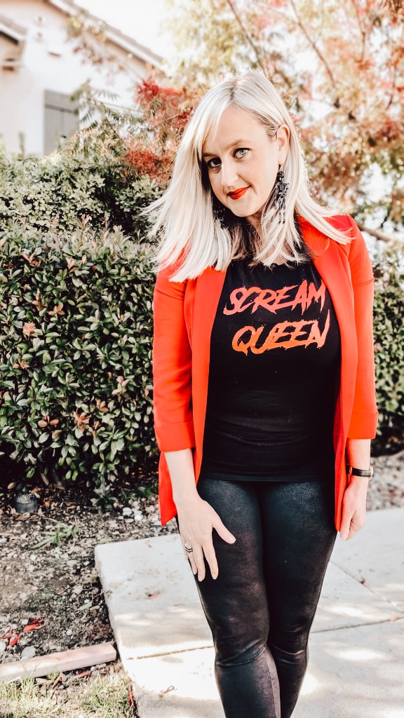 Work Halloween was hauntingly chic this year. I kinda became obsessed with this tee from Windsor so I had to get it not knowing what I’d ve with it. Pairing it with a blazer and faux leather leggings gave my zoom meetings a whole VIBE. Would be equally chic with a wig and leather skirt and devil horns for a All Hallow’s Eve night out!