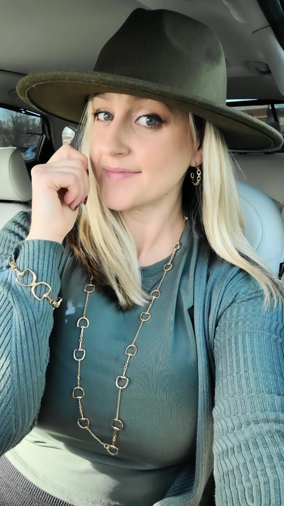 Tee and duster: Express; Ribbed leggings: Fabletics; Hat: DSW; Lug Boots; Shoedazzle; Horese Bit Jewelry: Avon.