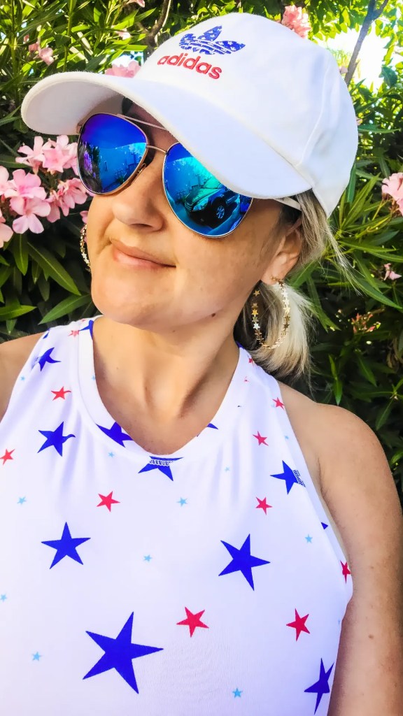 Hat: Adidas; Tank: DSG – Dick’s Sporting Goods; Cropped Leggings: Old Navy; Star Hoops: Nanamacs