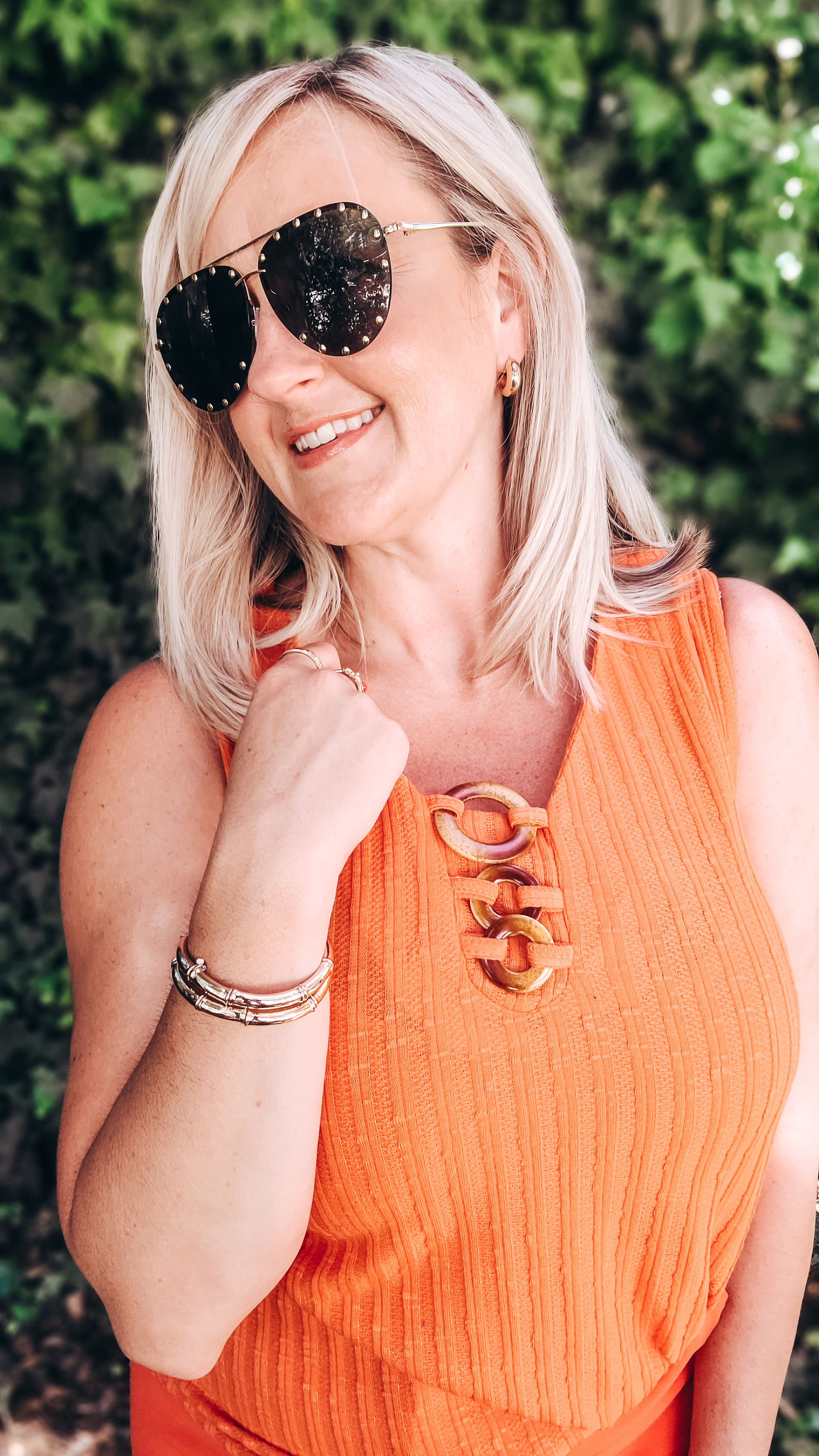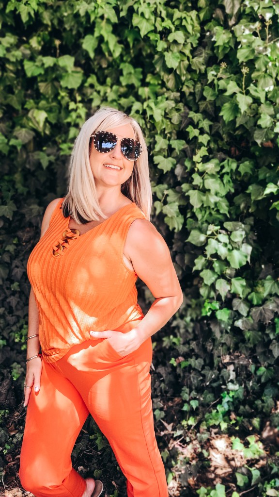 Orange was such a hot color this year and it’s going to continue to be. My wear now look is a matchy matchy monochromatic vibe with some ankle pants. This would also look great with a linen pant or short right now or paired with a brown bottom come fall (brown is also a hot color this yr!) Could pair this with your fav jean and layer a cozy cardi over it for the ultimate fall look. This tank is so versatile, an easy fit, and the tortoise details are a nice touch.