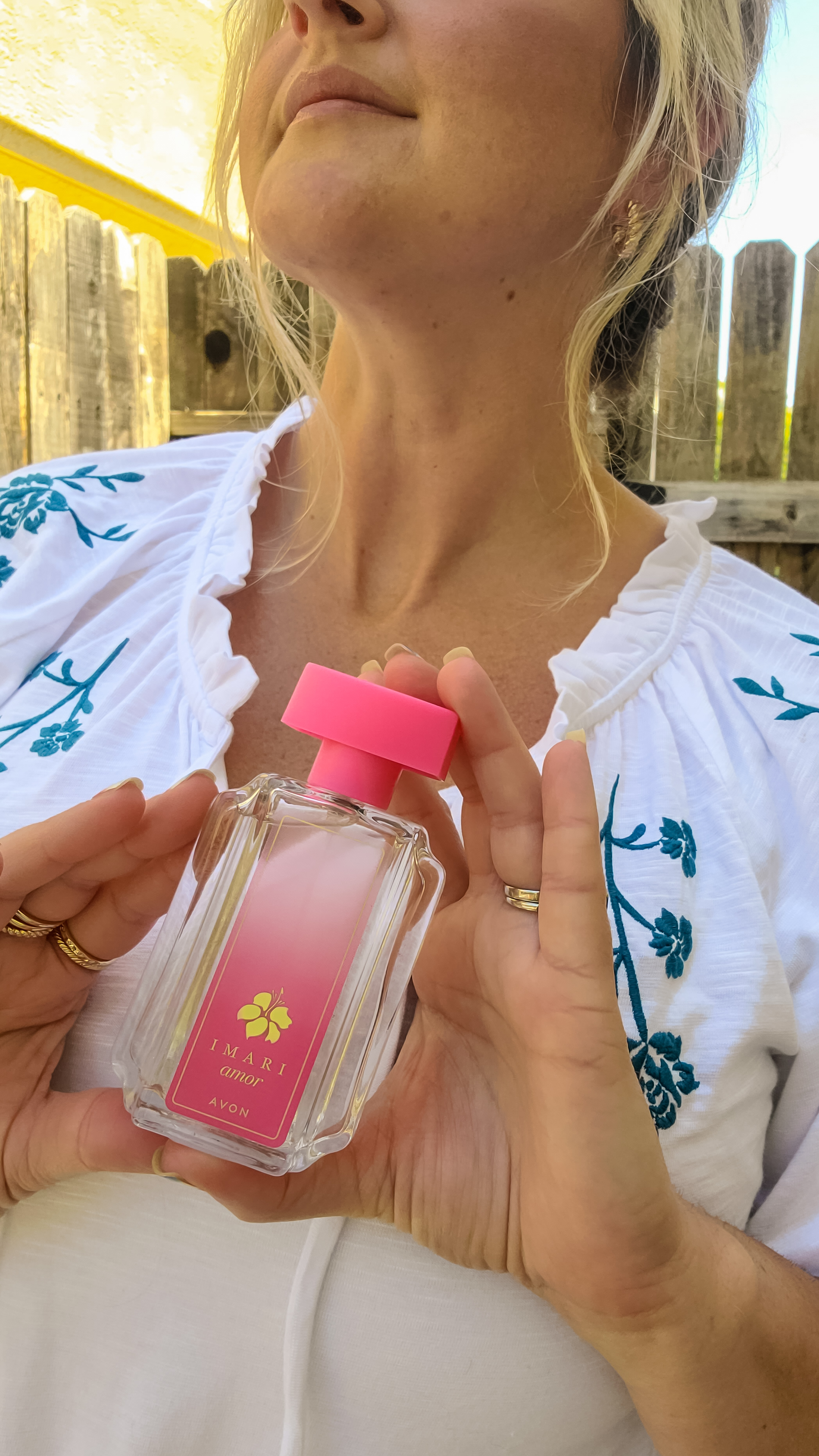 Coastal Grandmother was a trending term for basically something that a chic grandmother living her retirement seaside would wear in her daily life. Think easy pieces in neutral colors. I like this blouse which is a comfy t-shirt material with the cutest embroidery in a chic teal. I paired it with some khaki denim shorts to keep it neutral. This would look great with denim shorts or a ditsy floral skirt. Transition it into fall with a pair of khakis or cords or even a plaid skirt! Speaking of coastal grandmother aka a modern take on something classic this new Imari Amor fragrance is the perfect pre-fall/ late-summer fragrance. Floral and warm and classic.