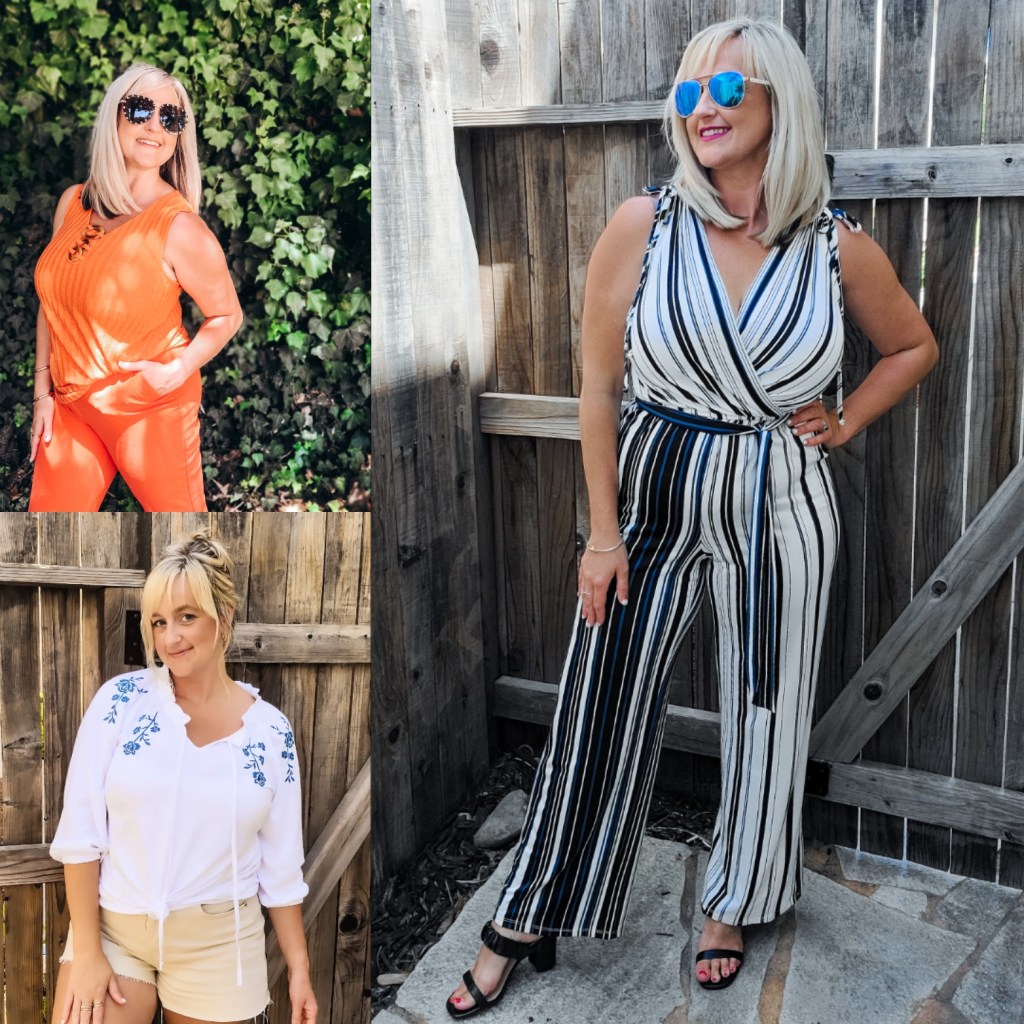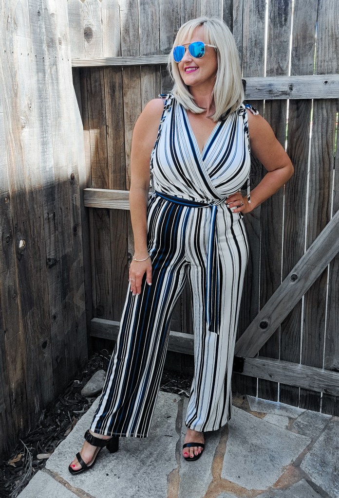 I just love this jumspuit! The stripes, the pop of teal, the wrap front, the tie details… this is such a fun item! I wore this simply on its own with some silver jewelry and trendy black sandals. It was a perfect piece for work from home as its so comfortable and looks good on camera. For fall this is going to be so so good with a black leather jacket! You could even layer a sheer turtleneck or a fitted tee undeneath or a classic black blazer over it. Either way this is a fun item you can get some mileage out of.